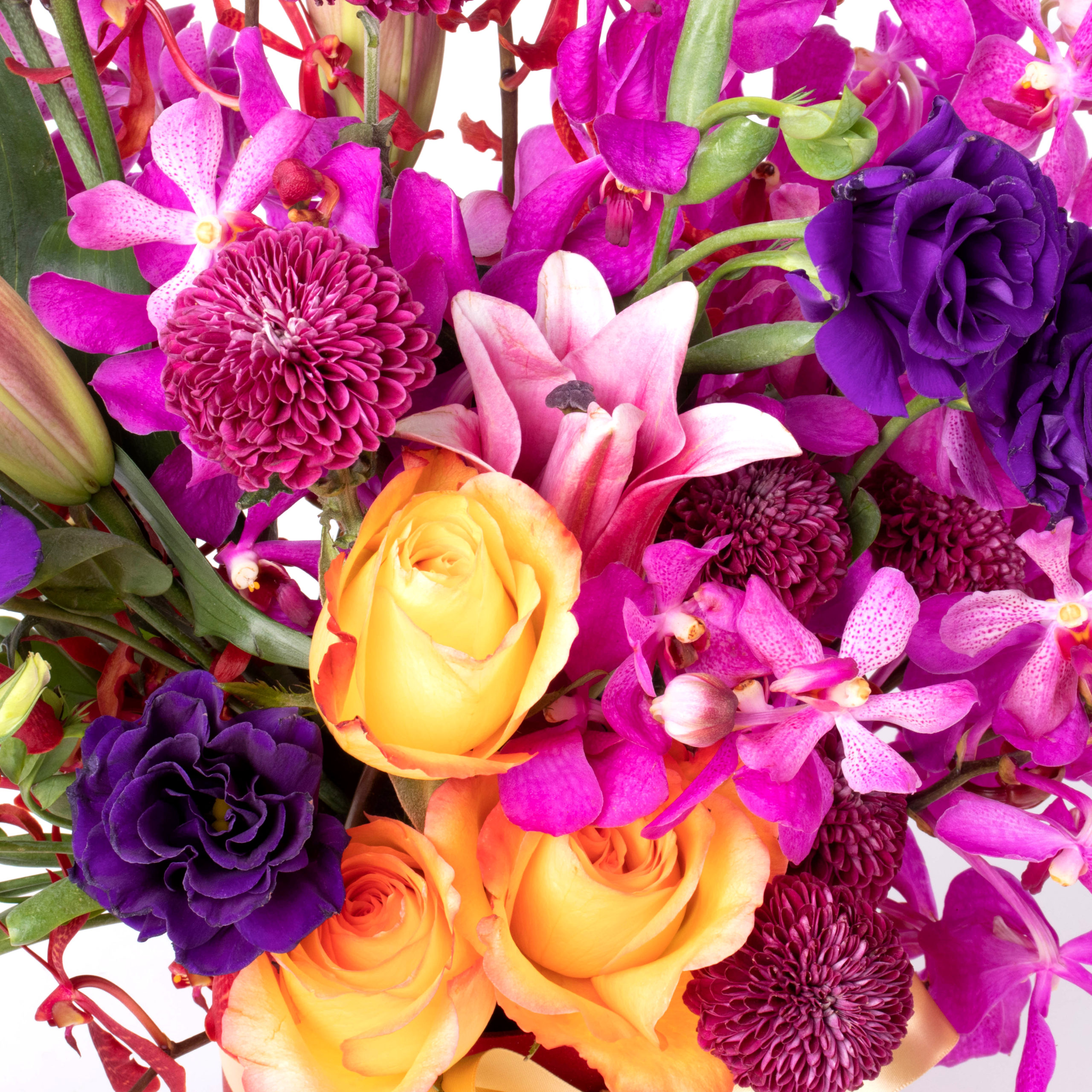 This arrangement features Lily Oriental, Orchid, Mokara Orchids, Ping Pong, Roses and Eustoma.