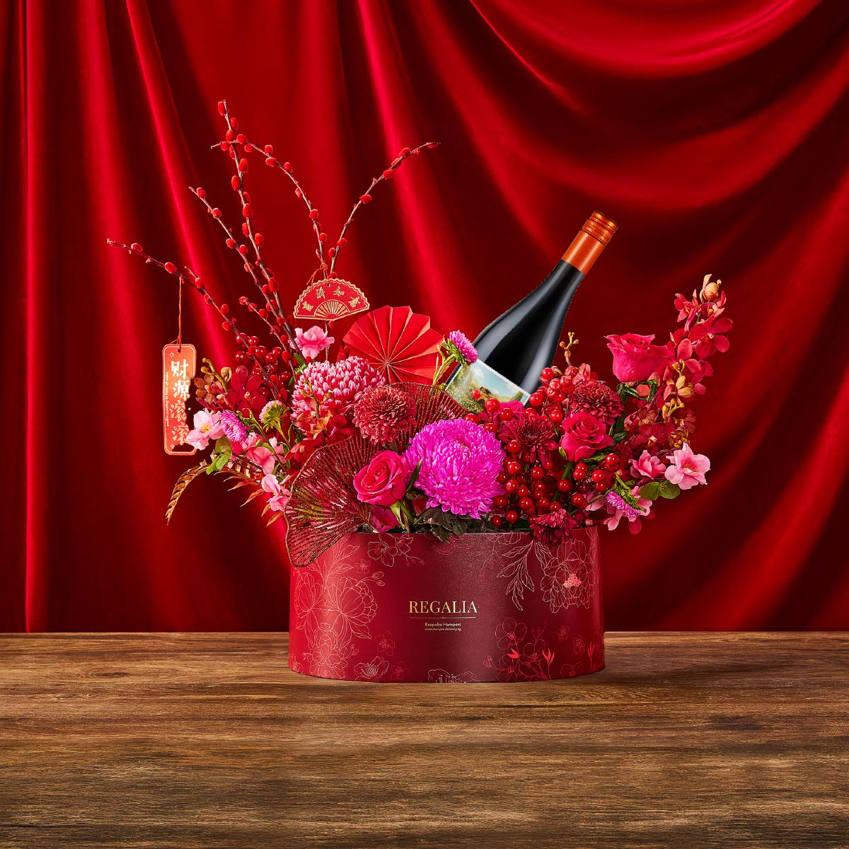 Complementing the wine is an arrangement of vibrant red and pink fresh blooms, symbolising prosperity, renewal, and heartfelt celebration. The combination of sustainable elegance and natural beauty makes this hamper a standout choice for recipients who appreciate thoughtful, purposeful gifting.