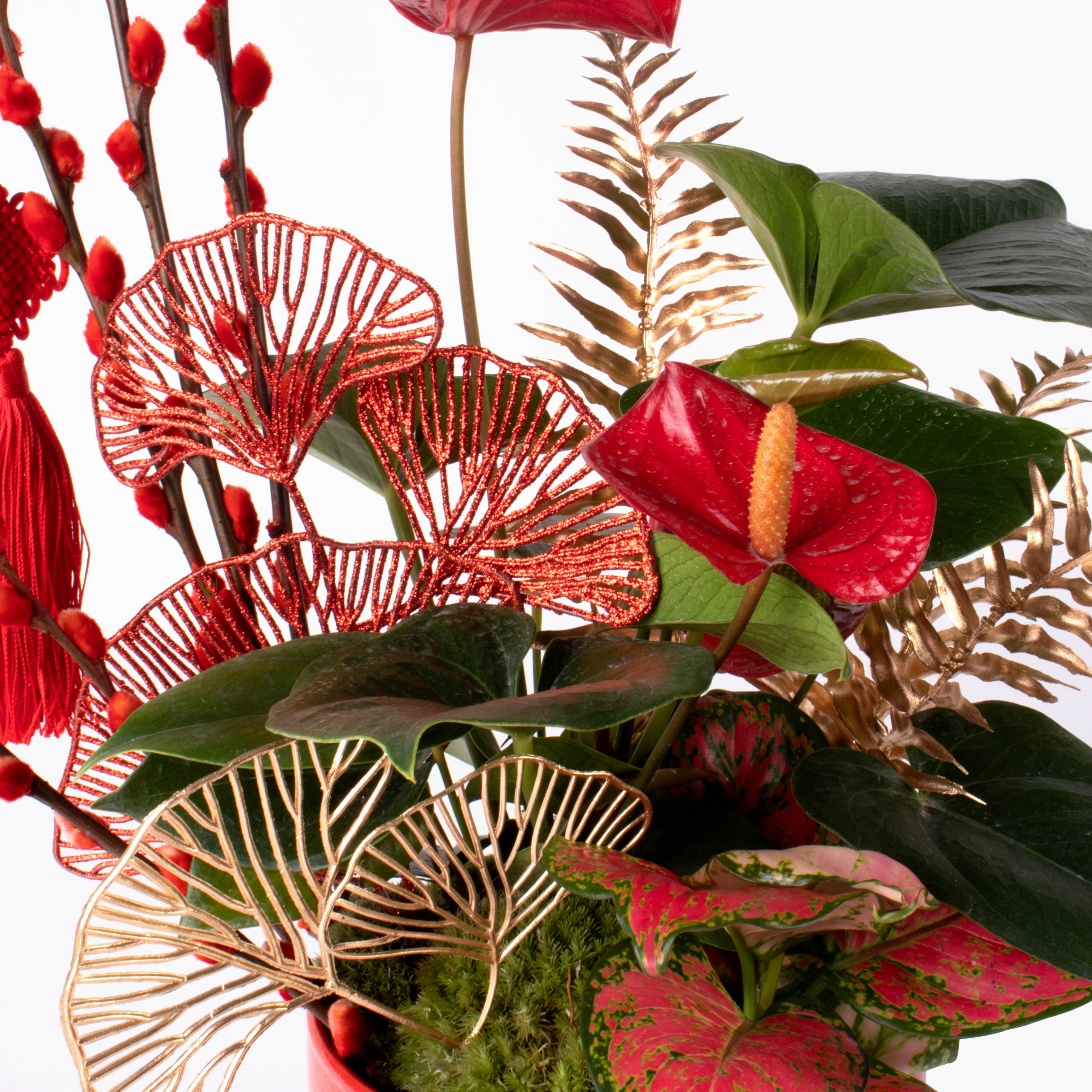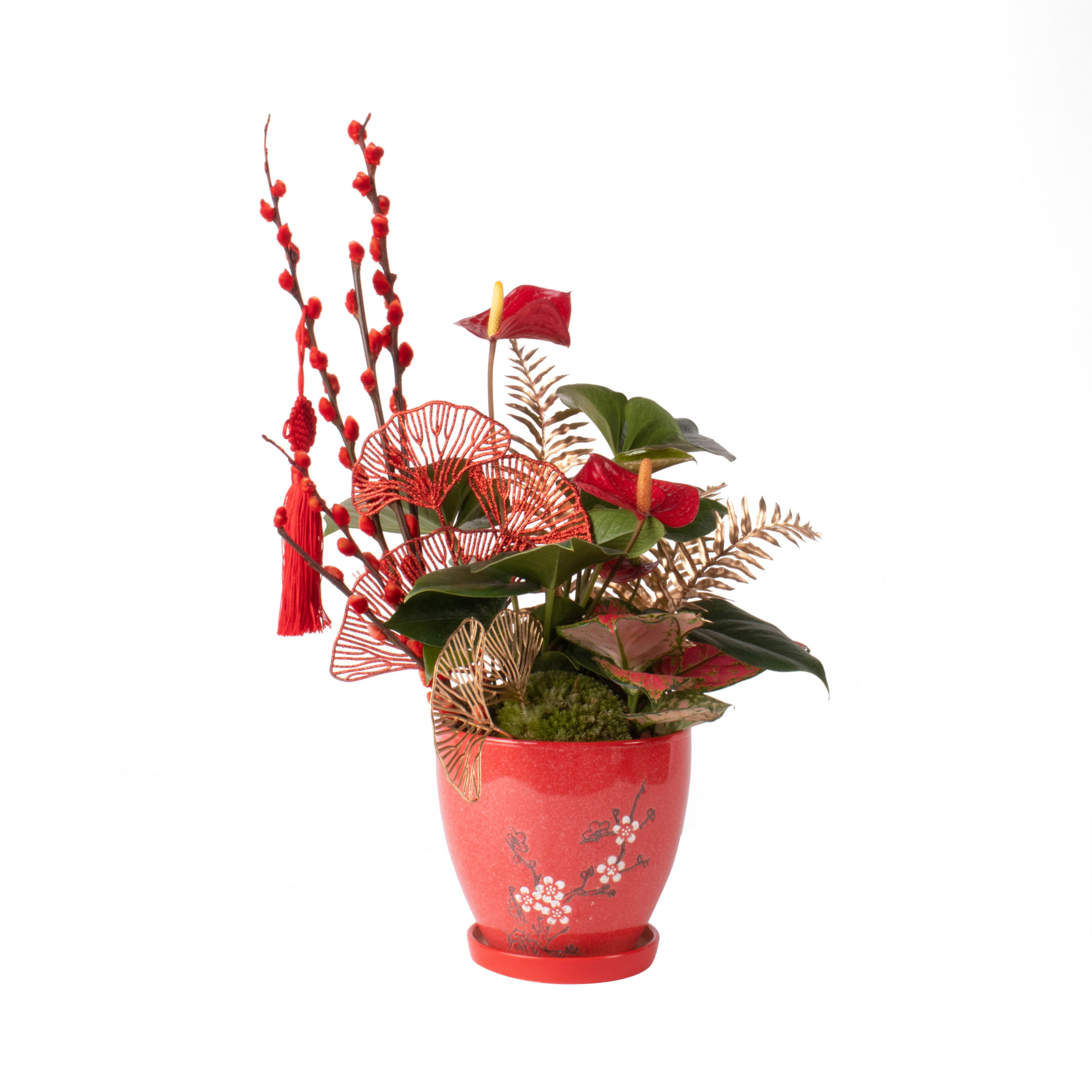 This arrangement features Red Aglaonema, Pussy Willow, Red Anthurium, Moss, Soil, and Premium Extravagant Pot.