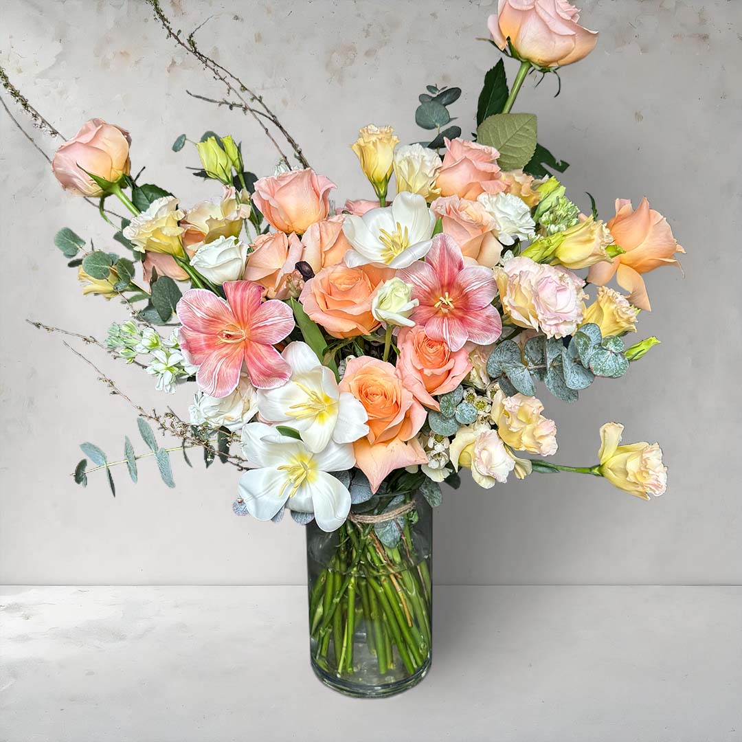 Enjoy the delicate beauty of our ultra-premium, ultra-large Peach Serenity Whisper bouquet. With tulips, roses, eustomas, eucalyptus, and spiraeas, this arrangement adds a gentle touch of elegance to any setting.
