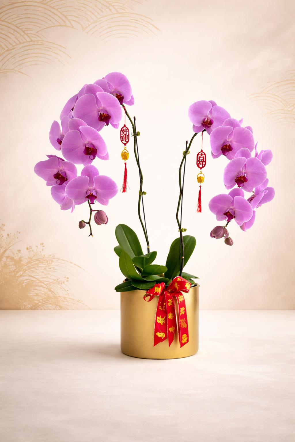 A minimalist yet striking gift featuring two large, vibrant purple orchids. Perfect for adding a touch of elegance to any space or as a sophisticated token for someone special.