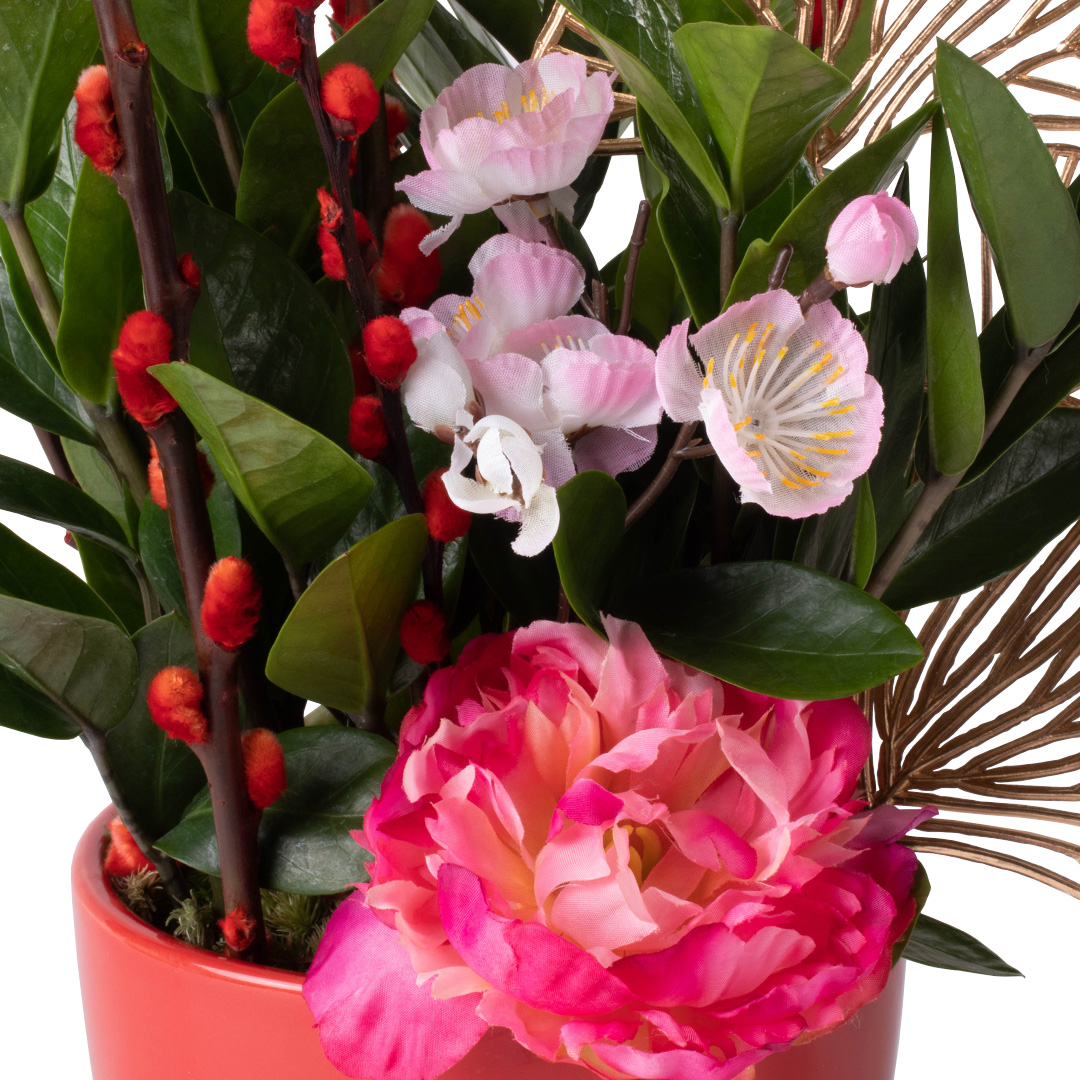 This arrangement features Red Money Tree Plant, Pussy Willow, Hyperrealistic Artificial Flower, Moss, Soil, and Premium Extravagant Pot.