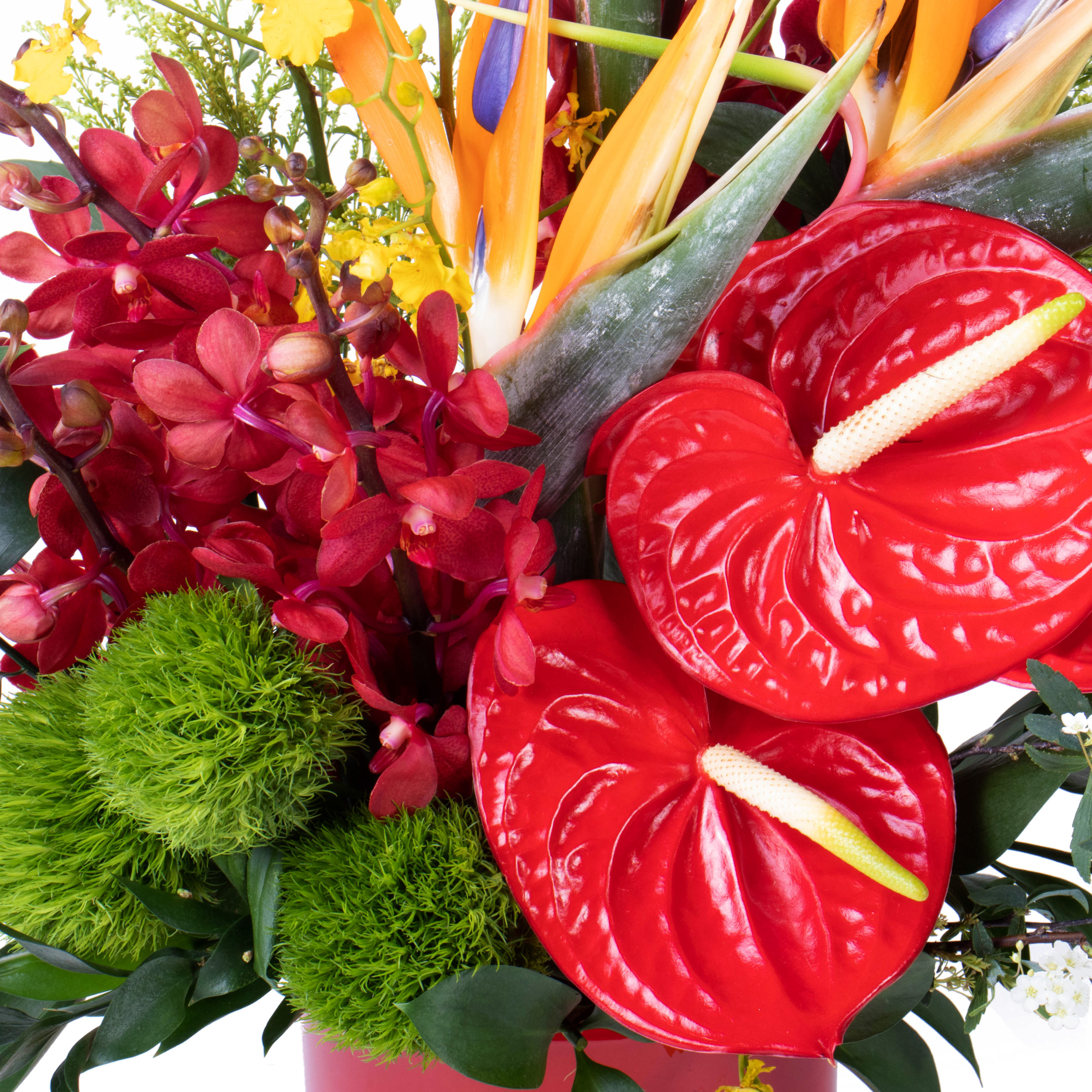 This arrangement features Bird of paradise, Anthurium, Mokara Red, Gold Ramsey and Green Trick.